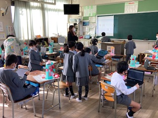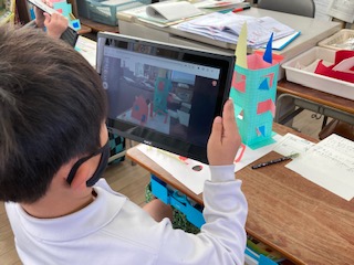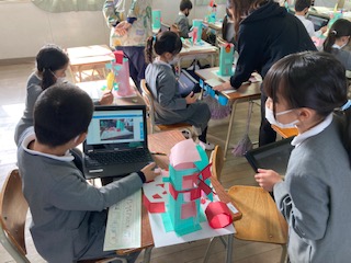 2年生の子どもたちがお互いの図工の作品を鑑賞し合っていました。お友だちの上手なところはどこかな。どんな工夫をしてるかな。頑張っているところはどんなところかな。みんな自分の作品を見てもらって、とてもうれしそうです。お気に入りの方向からパソコンで写真を撮って、先生に送信(提出)します。そんなことも子どもたちはできます。すごいですね。