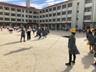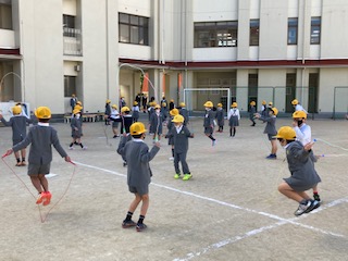 今日から[なわとび週間]が始まりました。寒さに負けない体づくり、体力の向上を目指して、全学年で取り組みます。1.3.5年生と2.4.6年生で曜日や時間を分けて取り組みます。一人で跳んだり、みんなで跳んだり、笑って跳んだり…。しっかりと子どもたちは体を動かしていました。