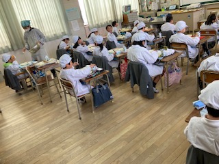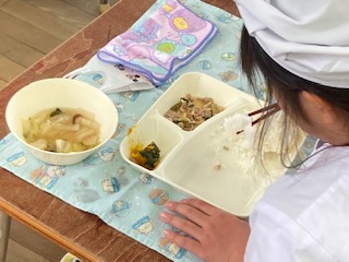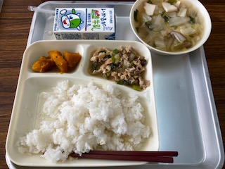 今日の給食のメニューは、豚肉と干しずいきのみそ煮、うすくず汁、焼きかぼちゃの甘みつかけ、牛乳、ごはん、でした。干しずいきは里芋の葉柄のことで、カルシウムや鉄、食物繊維が多く含まれています。うすくず汁はかまぼこや白菜、大根、たまねぎ、しいたけ、三つ葉を使っていて具だくさんでした。かぼちゃを冬至(今年は12/22)に食べると、風邪をひかずに健康に暮らせると言われています。