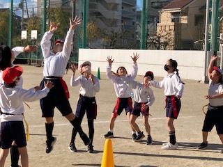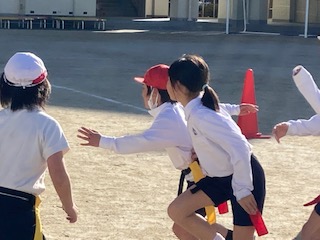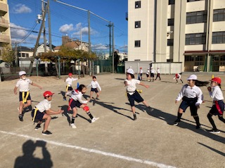 4年生の子どもたちが運動場で元気いっぱいに動き回っています。腰につけたタグを奪い合いながら協力してボールを運んでいきます。小春日和の中、躍動感あふれる子どもたちの姿が見られました。