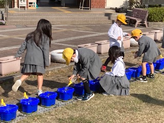 今日も小春日和です。休み時間には1年生の子どもたちが、たくさん出てきました。先日にみんなでチューリップの球根を植えたので、水やりをしている子たちがいました。春になると色とりどりのチューリップの花が咲きます。何色かなあ。この時間はくつ飛ばしをする子が多かったです。あーした、てんきになあれ!って、なんとなく懐かしい感じがしました。1年生の子どもたち、笑顔がかわいらしかったです。