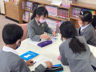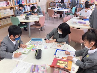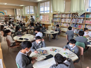 3年生の国語の授業で、[本を紹介しよう]という学習です。友だちにぜひ読んでもらいたい本の名前とその理由を紹介します。その時に例として先生が紹介したのが[うどん対ラーメン]でした。さすがですね。…でも残念ながら図書室にはこの本がないとのこと、ごめんなさーい。