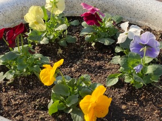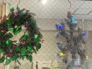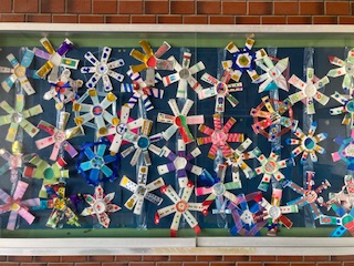 玄関先の掲示板には、雪の結晶をモチーフにした子どもたちの作品が掲示してあります。一つ一つを近くで見てみると、とっても工夫がされていて、一人一人の個性が光ります。後ろを振り返ると、管理作業員室の窓にはクリスマスリースが飾ってあります。これも管理作業員さんの手作りで、登校してきた子どもたちの目を楽しませています。プランターの花も順次新しく植え替えていきます。