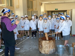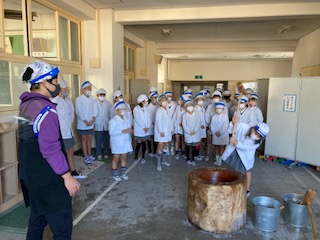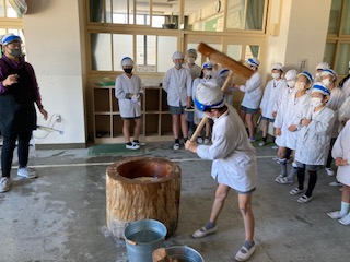 今日は、5年生の子どもたちが、おもちつきをしました。1学期にはバケツで田植え体験をしました。稲の生長の観察を続けて、秋には稲刈りをしてお米の収穫を行いました。その発展学習として、今日は、おもちつきです。きねの重さにふらふらしてしまう子、力強く振り下ろしていい音を立てる子、みんなでかけ声をかけながら楽しくおもちつきをしました。