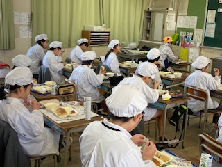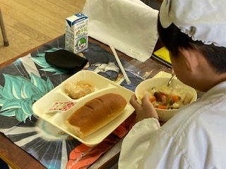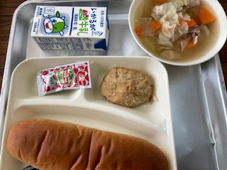 今日の給食のメニューは、豆腐ハンバーグ、カリフラワーのスープ煮、スライスチーズ、牛乳、パン、でした。豆腐ハンバーグはツナとたまねぎ、豆腐をこねて、一人分ずつていねいに丸めて形を整えていきます。食感はやわらかく美味でした。カリフラワーのスープ煮は彩りもあざやかで、チキンスープをベースにあっさりとした味つけでした。スライスチーズは一人一枚です。