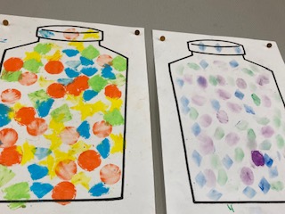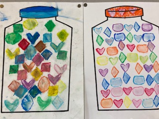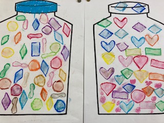 1年生の教室に子どもたちの作品が掲示してありました。キラキラで、カラフルで、まるでアメ玉のようです。いろいろな形を型抜きしたものを台紙に使って、色とりどりに色をぬっていきました。やっぱりアメ玉に見えてきました。どんな味がするのだろう?