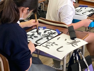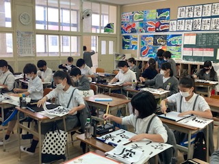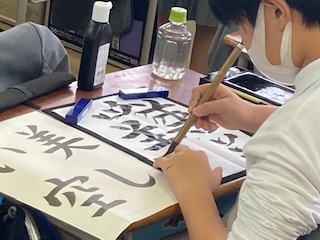 5年生の子どもたちが、習字をしていました。姿勢をよくして、筆を立てて、集中力を高めます。あーっ、でもなんか、うまくいかん。新しい半紙にまたチャレンジです。むずかしい部分を何回も練習している子もいました。納得のいく一枚を書き上げるって大変ですね、美しい空を思い浮かべて頑張ってくださいね。