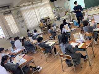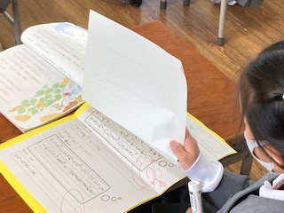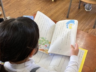 1年生の国語の授業、短い物語の学習です。おとうとねずみのチロの気持ちを表したかわいい言葉や動きが印象的なお話です。チロが発する言葉から、チロの気持ちはどんなかな?…先生の問いかけに、子どもたちは目を閉じて想像していました。前の時間のプリントを見ながら、お話の流れを振り返っている子もいました。