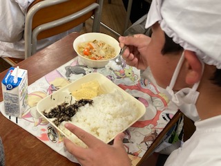 今日の給食のメニューは、たまごどうふ、一口がんもと野菜の煮物、魚ひじきそぼろ、牛乳、ごはん、でした。たまごどうふはプリンのようにやわらかく、茶碗蒸しのようでした。一口がんもと野菜の煮物は和風仕立てでしっかりと煮含められていて、具材に味がしみ込んでいました。魚ひじきそぼろは魚ミンチを使っています。
