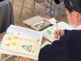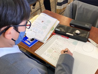 5年生の算数の図形の授業です。まずは正六角形です。6つの辺の長さ、6つの角の大きさがすべて等しい六角形について学びます。中心の角はそれぞれどうなってるのかな。先生と一緒に特徴について調べていきます。他にも、正五角形や正七角形、正八角形…もあるよ。これらの特徴も知ったあとは、次は作図の方法へと進んでいきます。できるかな、落ち着いてしっかり覚えていこう。
