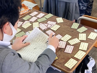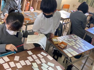 4年生の国語の教科書に百人一首が出てきます。百人一首は短歌を百首集めたもので、かるたの形で親しまれています。正直言って大人でもちょっと難しいですよね。五・七・五・七・七…、でも子どもたちは先生に配られたプリントをもとに、[見つけたー!][これやー!]と叫びながら一つ一つ確認していきます。子どもによってはほとんどを覚えてしまう子もいます。すごいですよね。