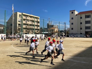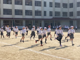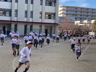 今日から約2週間、耐寒かけあし運動を行います。寒さに負けず、体力の向上を目指します。21日には淀川河川敷でミニマラソン大会を行う予定です。それに向けて、子どもたちは張り切っています。体育の授業でも学年の実態に合わせて取り組んでいきます。できるだけ密にならないように、1.3.5年生と2.4.6年生に曜日を分けて行っていきます。今日は2.4.6年生です。今日は比較的暖かく、子どもたちも楽しそうに走っていました。頑張れ、大道南っ子。