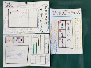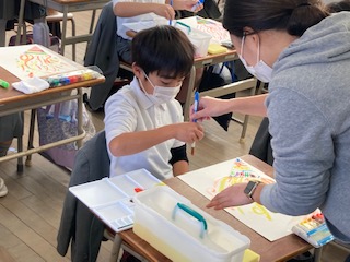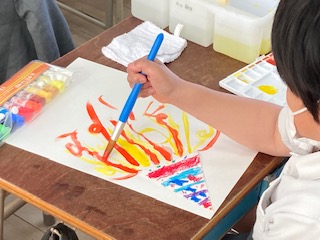 2年生の図工の授業です。パレットの使い方、ひっせん(筆洗)の使い方、机の上の整理の仕方…、わかりやすく先生が絵に表してくれました。絵を描く前の準備が大切です。しっかりと低学年のうちに覚えておくと、これからの学習に活かされます。子どもたちが楽しく活動している様子が見られました。今日はパーティークラッカーを描いていました。3色の絵の具を使って表します。みんなとても華やかでしたよ。