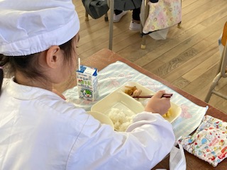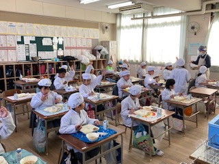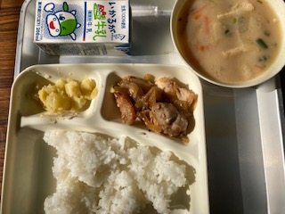 今日の給食のメニューは、鶏肉の甘辛焼き、かす汁、栗きんとん、牛乳、ごはん、でした。鶏肉の甘辛焼きはたれでしっかりと下味がつけられていて、ごはんによく合う一品でした。かす汁は年に一回だけ給食で登場します。具だくさんで寒い時期に体が温まります。栗きんとんは栗とさつまいもの自然の甘さが引き立っていておいしかったです。