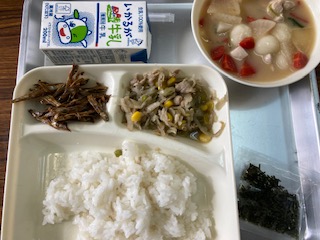 今日はお正月の行事献立でした。メニューは、きんぴらちらし、雑煮、ごまめ、牛乳、でした。きんぴらちらしは豚肉、ごぼう、コーン、グリンピース、かんぴょうを使って、粉末昆布を加えて旨みを増したまぜご飯です。きざみのりもかけました。雑煮はかつおぶしでだしをとり、白みそを多く使った関西風でした。白玉もちや金時にんじんが入っていました。まろやかな感じでおいしかったです。ごまめはおせち料理の一品で豊作を願って食べます。