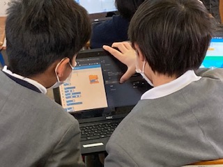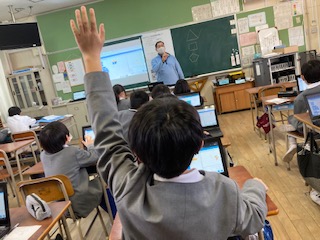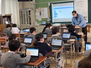 5年生の子どもたちが今習っている正多角形について、プログラミングによって作図することにチャレンジしていました。パソコン上のキャラクターに動きをプログラムして、その通りに動かします。辺の長さとして何歩歩かせて、角度を何度に設定して向きを変えて…。そしてまた歩いて向きを変えて…。どのようにプログラムすれば、どんな正多角形が描けるのだろうか。先生や友だちと相談しながら進めていました。