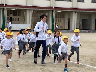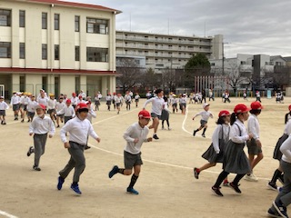 先週から始まった耐寒かけあし運動、今週もみんなで頑張ります。今日は1.3.5年生の日です。今日は先週に比べると日差しもなく、風も吹いていて肌に寒さを感じます。それでも音楽が流れると、子どもたちは一斉に元気よく走り出しました。次第にからだも温まってきました。どんどんスピードを増していく子もいます。1年生の子どもたちも先生と一緒に力強く走っていました。