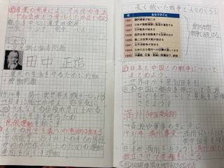 6年生のノートがとてもていねいです。社会の歴史学習のノートです。歴史学習は特にノートに書くことが多いです。先生も黒板にたくさん書きます。子どもたちは先生や友だちのお話を聞いたり資料に目を通したりしながら、上手にノートもとっていかないといけません。集中力も要りますね。でもみんな頑張っていました。さすが6年生ですね。感心しました。