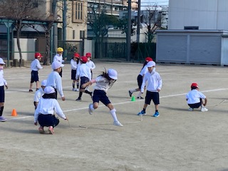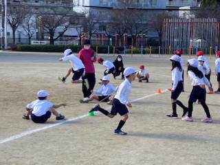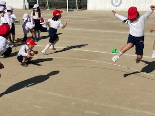 1年生の子どもたちがタイミングを見計らって上手にとびこえていきます。一人で。連続で。すごい、すごい…、先生からもお友だちからもほめてもらいます。みんなちょっと得意げな顔です。なわをへびみたいににょろにょろさせるのが得意な子もいました。こちらもほめてもらってうれしそうです。