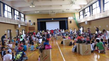 いよいよ校庭キャンプが始まりました。PTA会長中根さんのあいさつでみんな今日一日夏休みの思い出づくりを誓うとともに、この日のためにいろいろと準備をしてくださった地域の方々に感謝しました。