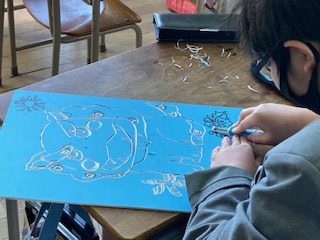 4年生の子どもたちが彫刻刀を使っていました。版画に挑戦です。彫刻刀は安全に使わないと思わぬケガをしてしまいます。先生から細かい指導を受けます。それでも時々危なっかしいときがあります。先生もこまめに子どもたちの様子を見て回ります。今回のテーマは[カラフルシーサー]です。出来上がりをカラーで仕上げる色版画です。みんな夢中で彫っていました。立ち上がって気合いが入ってる子もいましたよ。きっと自分たちの家の守り神になると思います。