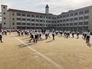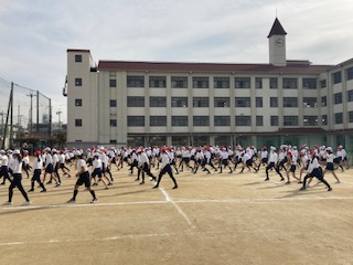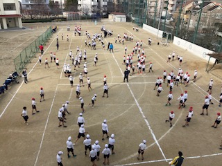 大道南小学校の運動場に6年生の子どもたちが200人以上集まっています。200人以上もいると、なかなか圧巻の光景です。先生の合図で準備運動が始まりました。そのあとルール説明を聞いて、グループごとに顔合わせです。よろしくお願いします…、お互いにあいさつを交わしてドッジボール交流会の開始です。4つのコートから、歓声や奇声?が上がります。運動場がにぎやかというか、とても騒がしい感じです。みんな楽しんでいました。思いっきりボールを投げて圧倒する子もいれば、遠慮がちにそっと投げてボールを渡す子がいたり、一緒に逃げ回っておしゃべりばかりしている子がいたり…、いろんな交流の仕方が見られました。