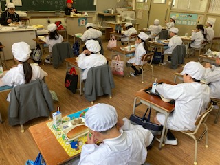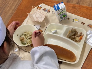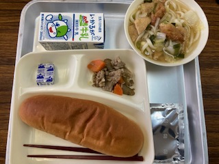 今日の給食のメニューは、豚肉とごぼうの煮物、なにわうどん、固形チーズ、牛乳、パン、でした。豚肉とごぼうの煮物は甘辛い味つけで、ごぼうの食感が楽しめました。なにわうどんは三角に切ったうすあげをだしで煮てから、かまぼこと白菜、青ねぎを加えて、だしの旨みを味わうことのできるシンプルなうどんに仕上げています。とろろ昆布が付いていました。固形チーズは一人一個です。