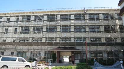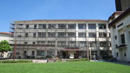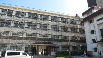 今年の夏休みはエアコンを学級につける工事がありました。いよいよ足場を取り外す段階に来ました。朝から作業員の方々が校舎の壁に設置されていた足場を取り外してくださっています。あっという間に解体作業は進みます。