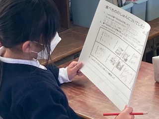 今日は他校から栄養教諭の先生に来てもらって、2年生の子どもたちに栄養指導を行いました。テーマは[食べものの旬(しゅん)について知ろう]です。