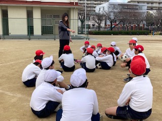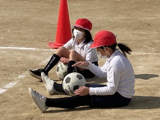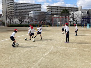 4年生の子どもたちが元気にサッカーボールを追いかけていました。先生の説明を聞いて、はじめは上手に蹴るための的当て練習をしました。次にドリブルしながら相手のボールをコートの外に蹴り出すサバイバルゲームです。みんな作戦を考えて挑みますが、そうそううまくはいきません。すぐに蹴り出されちゃいます。蹴り出されたら負けです。