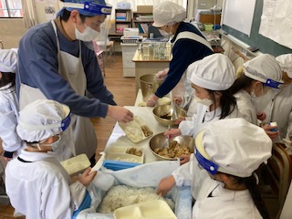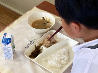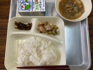 今日の給食のメニューは、まぐろの甘辛焼き、豚汁、茎わかめの佃煮、牛乳、ごはん、でした。まぐろの甘辛焼きはしょうゆベースのたれに白ねぎの風味が効いていて、ごはんとの相性もばっちりでした。豚汁は豚肉の旨みがみそ汁と合わさり、ごぼうの食感がアクセントになっていました。茎わかめの佃煮は味が十分にしみていました。茎わかめは、わかめの葉の太くかたい部分で、コリコリとした歯ごたえが特徴です。骨や歯を強くするカルシウムやお腹の調子を整える食物繊維などが豊富にふくまれたいます。