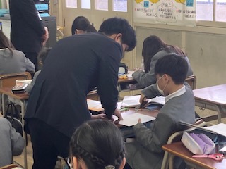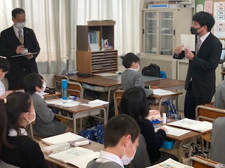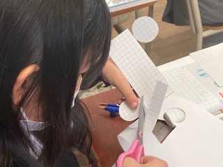 3時間目は5年生の授業で、指導・助言をいただきました。算数の授業で[円柱の展開図を描こう]です。側面の長さがポイントです。いったい側面の長さを何cmにしたらいいのか?みんなで考えます。底面の円周と同じになることをどうやって子どもたちに気づかせて導き出すのか、指導の工夫が必要です。子どもたちは自分で描いた展開図で無事に円柱を作ることができました。先生もホッとしていました。定期的にお互いの授業を公開しながら、授業改善や授業力向上に向けて努めています。