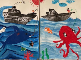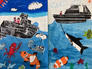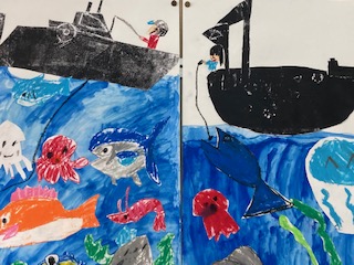 3年生の子どもたちの夢のある作品です。海の流れや波の様子がとても味があって上手です。船は版画で仕上げていて、生き物たちは別々に作って、後から貼り付けています。いろんな工夫がされていて、なかなか見ごたえがありました。教室が華やかな雰囲気になって元気も出てきます。