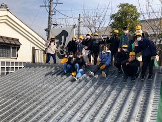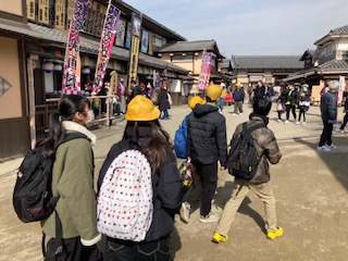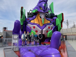 映画村内をみんな楽しんで歩き回っています。昔の町並みを眺めつつ、エヴァンゲリオンへ。