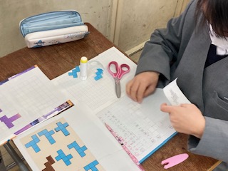 立方体の展開図は全部で11種類もあるみたいです。その中で、例えば、辺ABに重なるのはどの辺ですか?とか、頂点Cと重なる頂点をすべて見つけなさい?とか…、うーん、頭の中がこんがらがってクラクラしてきました。でも4年生の子どもたち、頑張っていました。実際に具体物を操作したり、先生と一緒にデジタル教科書で視覚的に確認したりしながら、何とか解決に向かうことができました。
