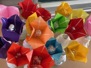 …と、むずかしい話は置いといて、後ろのロッカーの上にかわいいチューリップがいっぱいありました。ヤクルトのカップに絵の具を染み込ませたねんどを貼り付けて、小さな花びんを作っています。折り紙で作ったチューリップの中にはアルミホイルの飾り付けでひと工夫しています。2年生の子どもたちの心の花が咲いているみたいですね。