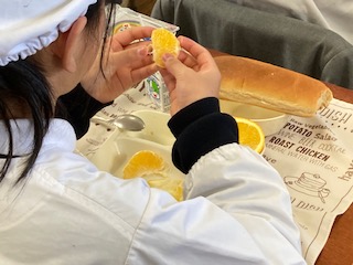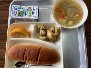 今日の給食のメニューは、鶏肉のカレー風味焼き、洋風煮、はっさく、牛乳、パン、でした。鶏肉のカレー風味焼きは粗挽きこしょうとガーリックが効いていて香ばしく、子どもたちの好きな味です。洋風煮はじゃがいもがホクホクしていて、野菜の旨みがしっかりと感じられました。はっさくは果汁がいっぱいでおいしかったです。