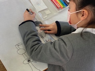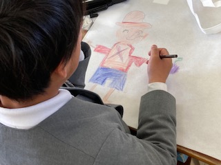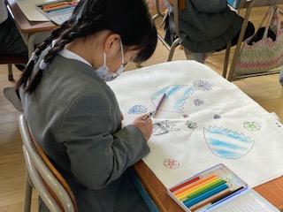 2年生の子どもたちが作品袋に絵を描いていました。作品袋は1年間に制作した絵画や工作などの作品を入れて持って帰る袋です。白い布地なので子どもたちが思い思いの絵を描いたりしています。2年生の子どもたちもこの1年間たくさんのすてきな作品に取り組んだので、いくつかは記念にお家で大切にしていただけたらと思います。