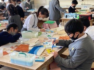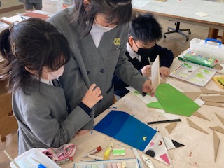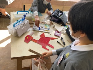 4年生の子どもたちが作っているメッセージボードが少しずつ形になってきました。のこぎりで切ったベニヤ板を貼り付けたり絵の具で色をぬったりして、自分たちがはじめにイメージしたものに近づいてきました。みんなでお互いに作品を見合いっこしながら楽しく進めていきます。