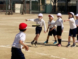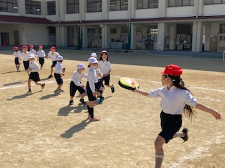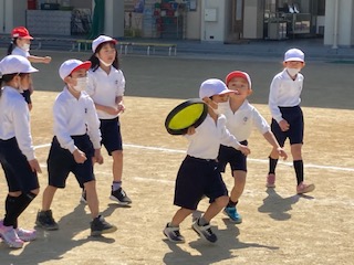 ドッヂビーはウレタン製のフライングディスクの一つで、普段のドッジボールと同じようなルールで遊びます。安全で当たっても痛くないし怪我もしません。手首のスナップをきかせて相手にめがけて投げます。でもカーブして曲がっていくので違う人が当たったりして、そこもおもしろいところです。楽しんで活動する1年生の子どもたちの元気な声が運動場に響いていました。