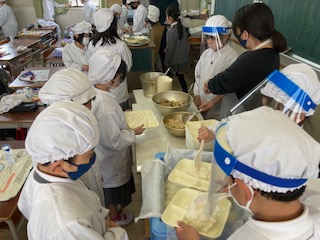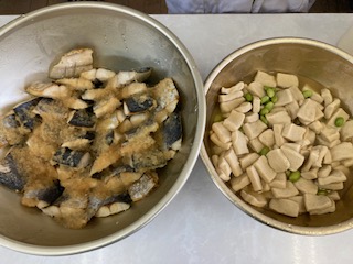 今日の給食のメニューは、さごしのおろし醤油かけ、里芋と野菜の含め煮、高野豆腐の煮物、牛乳、ごはん、でした。さごしのおろし醤油かけは下味をつけて焼いたさごしに、みりんと醤油で味つけした大根おろしをかけています。ごはんがすすみます。里芋と野菜の含め煮は具だくさんで、里芋がやわらかくておいしかったです。高野豆腐の煮物は甘くて、彩りにむきえだまめが一緒に入っていました。