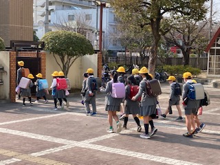 5時間目に地域子ども会と集団下校を行いました。1年間を振り返って反省をしたり、1年間お世話をしてくれた6年生のお兄さんお姉さんに感謝の気持ちを伝えたりしました。今日の集団下校から新しい班長さんになりました。おもに5年生が中心になると思いますが、明日からよろしくお願いしますね。それに合わせて9.10.13日は集団登校強化週間とします。みんなで時間通りに登校できるよう、子どもたちに声かけをお願いします。