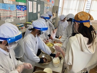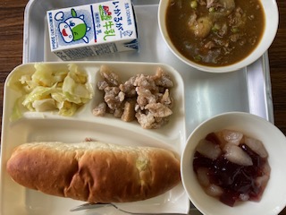 今日の給食のメニューは、フライドチキン、カレーシチュー、キャベツとコーンのサラダ、フルーツゼリー、牛乳、パン、でした。フライドチキンは鶏肉のからあげにオールスパイスを使って洋風にアレンジしています。カレーシチューは濃厚で牛肉の旨みとコクが感じられました。キャベツとコーンのサラダは甘酸っぱい味つけでさっぱりとしていました。フルーツゼリーはぶどうゼリーと和なしを合わせています。今日のメニューは[卒業お祝い献立]です。いつもより一品多くなっています。6年生の子どもたちも[いつもより多いなぁ]と喜んでいました。