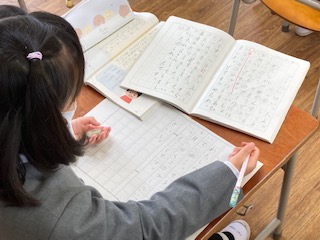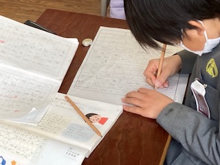 1年生の子どもたちが国語の学習で文章を書く練習をしていました。[文]から短い[文章]へ…、1年生も学習内容を少しずつ深めていっています。今日のテーマは[人に伝えたいできごと]です。伝えたいできごとは何か?それはいつのことか?その時の様子はどうだったか?どんなふうに思ったのか?…、などを簡単にまとめて短い文章にしていきます。先生に見てもらいながら少しずつ書き上げていきます。1年生が1枚の作文用紙を仕上げるってすごいことですよね。頑張ってくださいね。