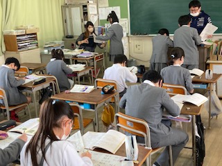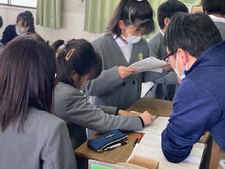 算数の授業で4年生の子どもたちが、ふりかえりタイムです。今までに学習したことがきちんと身についているか、どんどん練習問題に取り組みながら確認していきます。できたら2人の先生に見てもらいますが、次から次へと子どもたちがやってくるので、先生たちも大忙しです。でもていねいに子どもたちのつまずきをフォローしてあげていました。