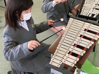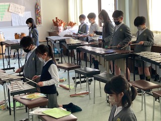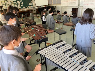 4年生の子どもたちが[茶色の小びん]という曲を演奏していました。全員が鉄琴と木琴に分かれて練習していました。いつも合奏する時には他の楽器もたくさん使うので、鉄琴や木琴がやりたくてもできない子が出てきてしまうのですが、今日は全員が鉄琴と木琴なので、みんなうれしそうな顔をしていました。結構やってみると打ち方がむずかしいんですよね。