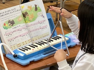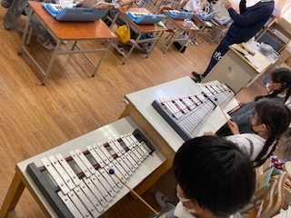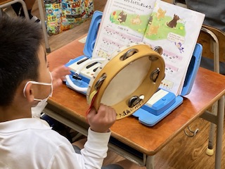 1年生の子どもたちがみんなで[こいぬのマーチ]を合奏していました。使う楽器は、鍵盤ハーモニカ、タンバリン、カスタネット、すず、トライアングル、鉄琴です。みんなで役割分担をしてリズムを合わせながら演奏していきます。子どもたちの気持ちがはずむような音色が教室中に響いていました。