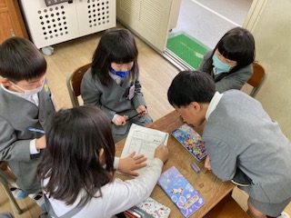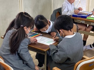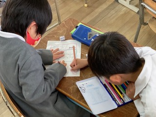 2年生の子どもたちが学級のかかり活動を決めたあと、それぞれに分かれて各係のカードを作っていました。仕事内容を書いたり、色えんぴつで飾ったりしていました。仲よくおしゃべりしながら作っている様子を見て、とても微笑ましく思いました。これからしっかりと自分たちのお仕事を頑張ってくださいね。