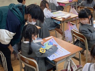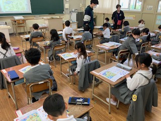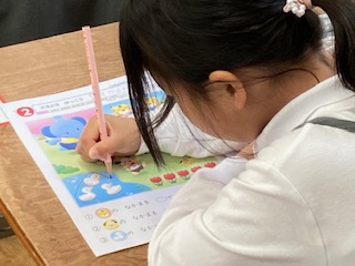 1年生の子どもたちがさっそくお勉強です。算数の学習です。絵を見て同じ仲間をえんぴつで囲んで仲間分けをしたり、数を数えたり、多い方はどちらかな?をしたり…、先生にすごいねって声をかけられて、子どもたちもうれしそうにしていました。先生の顔もにこっと笑っていました。