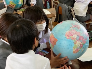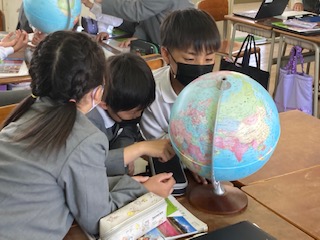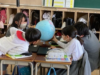 5年生の子どもたちが熱心に地球儀をのぞき込んでいます。5年生はこれから社会の学習で日本のことを学習していきます。日本っていったいどこにあるのだろうか?みんなで地球儀を使って調べます。世界地図は地図帳でよく見ますが、地球儀はあまり見ないので、子どもたちも興味津々です。続けて、世界にも目を向けていきます。たくさんの国があるんだね。知っている国はいくつあったかな?
